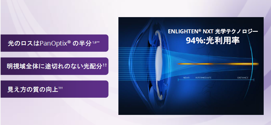 多焦点レンズで懸念される「ハロー(光の輪)」や「グレア(まぶしさ)」、「スターバースト(光が散る)」といった症状についても改善されたと報告されています。